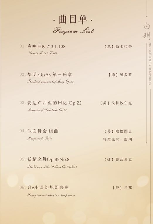 不是所有的鲜花都盛开在春天,不是所有的河流都流向大海。只要热爱,山河皆可平,无处不是风景。白玥钢琴毕业音乐会,带大家走进音乐的海洋,让我们一起聆听音乐、感受音乐,投入到音乐的怀抱中!