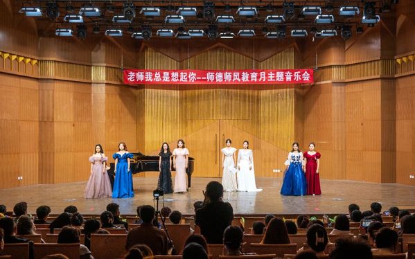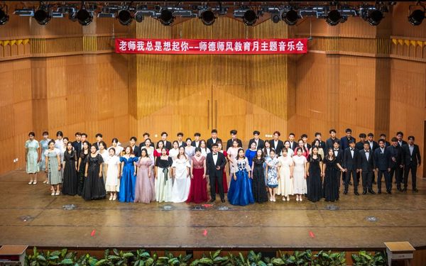 承办,以“老师我总是想起你”为主题,节目编排上以“赞颂教师”“怀念恩师”“感恩老师”三个主题的歌曲贯穿始终,采用了独唱、合唱、表演唱等形式,为全校师生呈现了一场高标准、高质量、高审美的视听盛宴。开场节目《待风来时》,赞颂了教师梅兰竹菊般的高尚品质;《不忘初心》展现了中华民族昂扬奋进新征程的精神风貌;《手挽手》表达了华夏儿女齐心协力创造新辉煌的昂扬斗志;《感恩的心》《感恩》《奉献》《老师我想你》《老师我总是想起你》等歌曲,唱出了学生对老师的绵绵情谊;《教师颂》表达了学生对教师的崇高敬意;《长大后我就成了你》更似一团薪火,点燃了学生对教育事业的一片赤诚。13首歌曲,80余位学生的倾情演唱,赢得了现场600余位师生们的高度认可与好评。