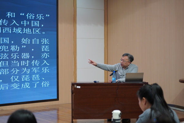 3月17日上午,在做爱动漫 正声厅,李宏锋教授主讲了《从唐宋宫调理论实践看“中国乐系”的基本特征——兼论新疆传统音乐音体系的三原色构成》。李宏锋教授强调了中国传统音乐文化、传承发展民族音乐的作用,让学员们充分认识到学习相关理论知识的意义。并系统梳理了从汉朝到南北朝时期音乐发展脉络。他从汉朝音乐以雅乐、俗乐为主,胡乐自长城以北及伊朗西域地区初传入讲起,阐述张骞通西域带来胡曲与乐器,以及胡乐初期对俗乐影响转变的过程。李宏锋教授讲解时条理分明,结合音乐实例与历史故事,将复杂的音乐发展历程与理论知识生动呈现,助力学员构建起清晰的知识框架。