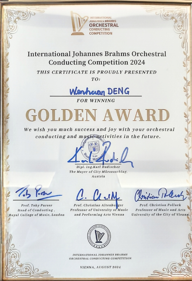 8月4日晚,大赛在举世瞩目的维也纳金色大厅的勃拉姆斯厅举办了获奖音乐会,到场观众座无虚席。米尔茨市市长现场向获奖选手颁发了盖有市政府印章的证书。