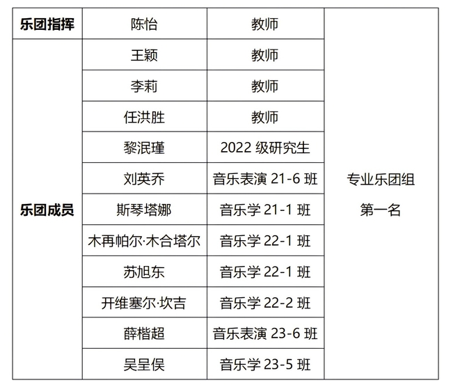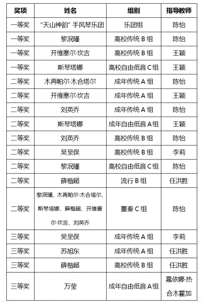 “天山神韵”手风琴乐团在第74届手风琴世界锦标赛(CMA)大赛中,斩获国赛专业乐团组第一名;乐团成员2022级研究生黎泯瑾、音乐学22-2班开维赛尔·坎吉分别获得成人古典组一等奖、三等奖。