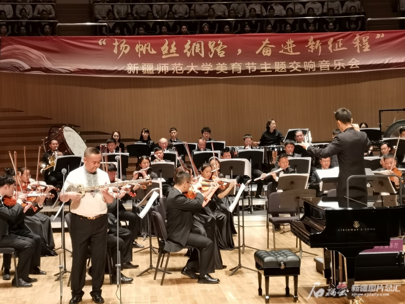 美育节活动中首次举办主题交响音乐会,演出曲目以爱国歌曲为主,音乐会中还融入了热瓦普、艾捷克、琵琶、二胡等民族乐器,“希望以音乐会的形式,推动中华优秀传统文化深入人心,铸牢中华民族共同体意识,切实提高学生的审美和人文素养。”