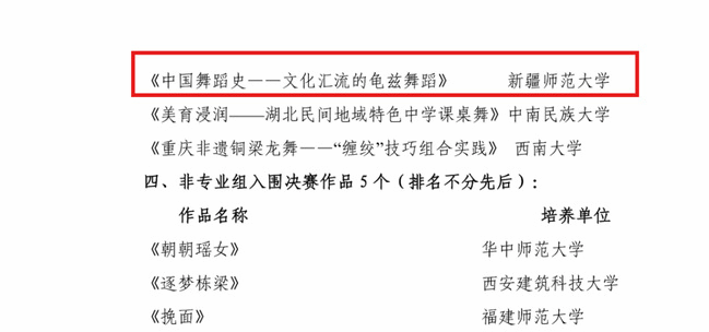 滕莹、肖尧轩两位教师指导、2023级研究生黎莹莹负责的作品《中国舞蹈史——文化汇流的龟兹舞蹈》入围了第一届中国研究生“文化中国”两创大赛(舞蹈赛道)总决赛。