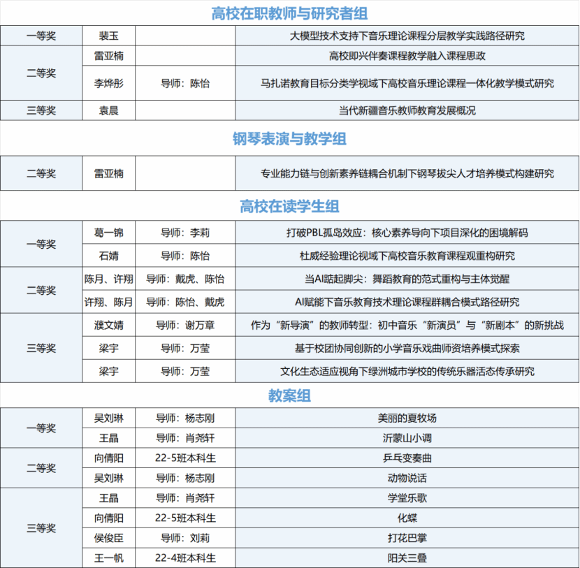 在刚刚结束的2025国民音乐教育大会“万叶杯”论文(教案)征集评选活动中,我院师生荣获多项佳绩,其中一等奖5项,二等奖7项,三等奖8项。