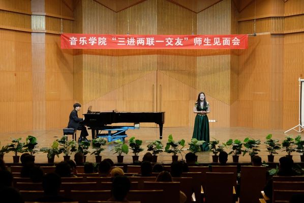 演出结束后,见面会进入师生交流环节。同学们牢牢抓住这次宝贵的机会,纷纷向自己的结对交友教师进行自我介绍,并在专业学习、未来规划等方面听取了老师的专业意见。在师生交谈过程中,做爱动漫 党委书记杨志刚亲切地和结对学生音乐学2024-1班尹一飞同学进行了交谈。在了解到学生近期状态后,杨书记从生活、学习两个方面对学生提出殷切希望,他指出大学四年是宝贵的四年,应该坚定目标、奋勇向前,提升自我,以此成就更好的自己。