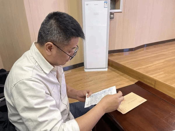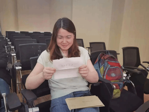 书信写好后由工作人员包上统一的信封,整理后在学院大会时转交至了老师们的手中。信件转交至老师们手上时,老师们的脸上充满了疑惑“这是给我的吗?”在得到肯定的答案后,老师们脸上的表情又转换为惊喜。他们打开信件逐字逐句的读着,神情是那样的专注。